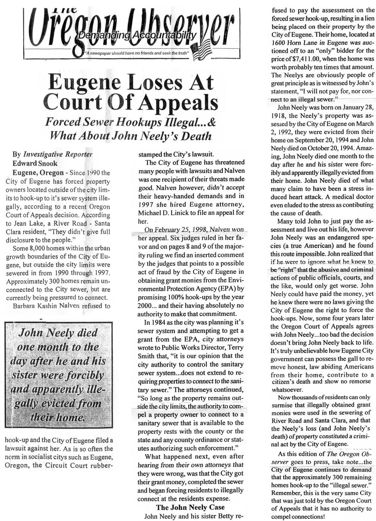 The Oregon Observer Article: Eugene Loses At Court of Appeals (1998)